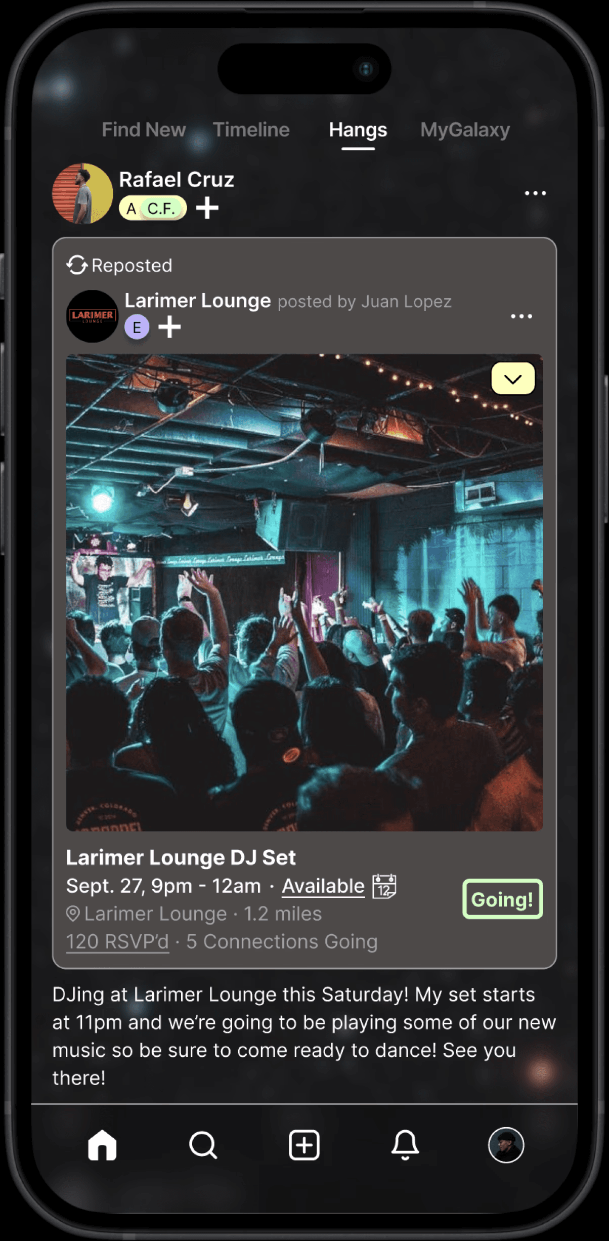 A separate Hangs feed features user created event invites. Organizing get togethers with your connections no longer requires large unorganized text groupchats and everyone's availability can be taken into account intuituively.