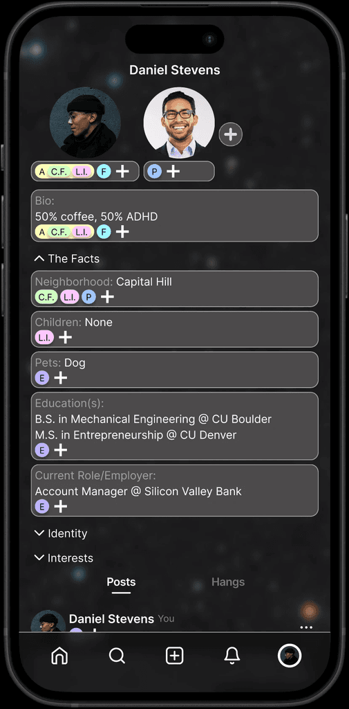 Using the same relationship/visibility tagging system for posts, users can add many details about themselves for better new connection recommendations, but customize who has visibility to those details.